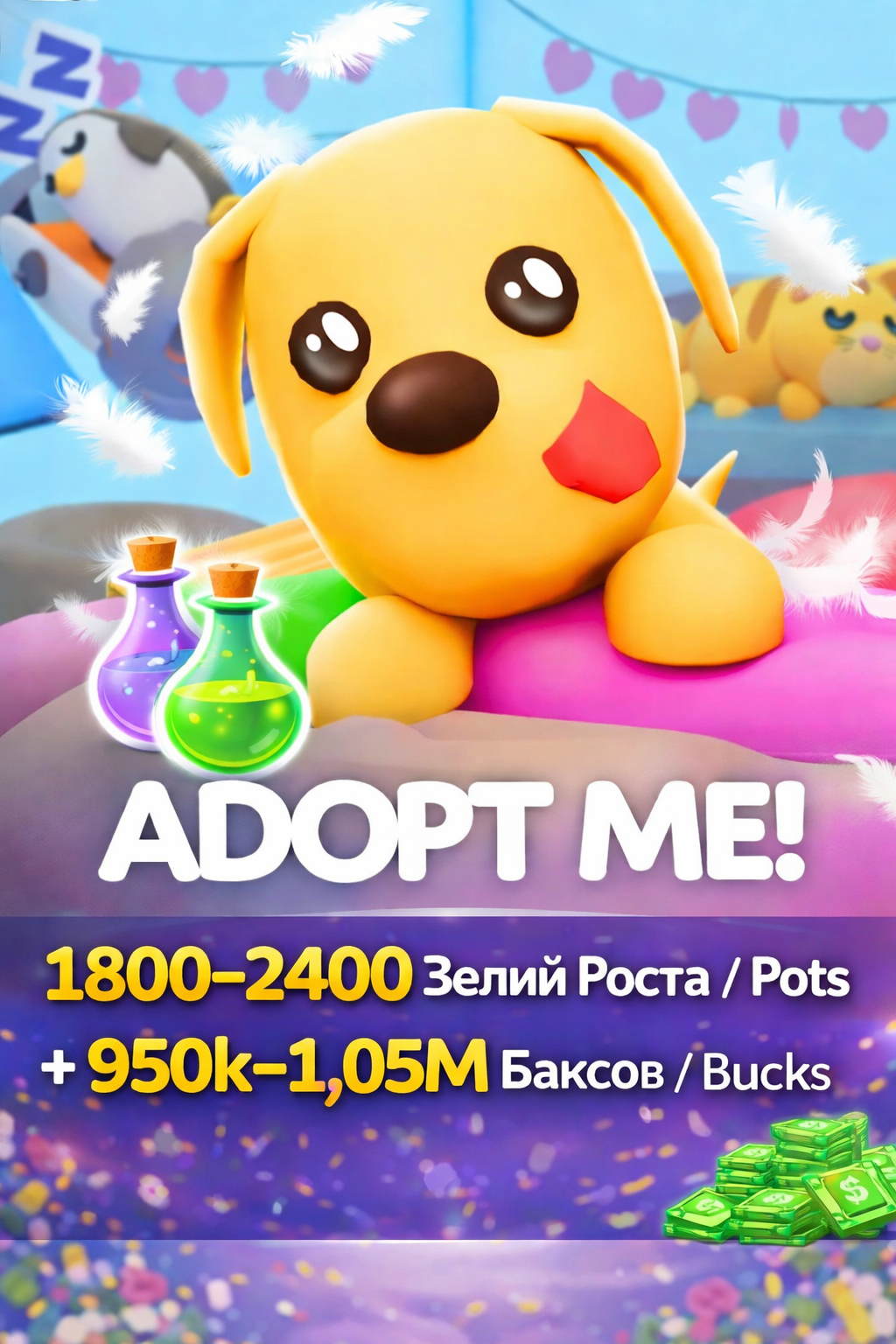 Adopt Me 1800-2400 Pots/Зелий Роста + 950k-1,05M Баксов