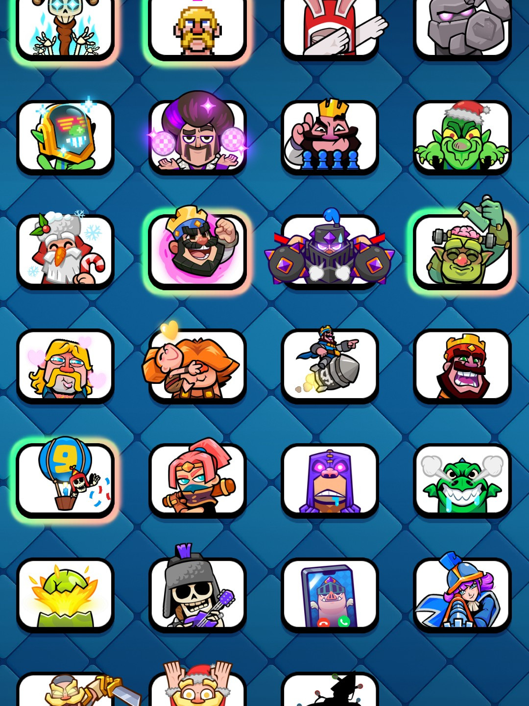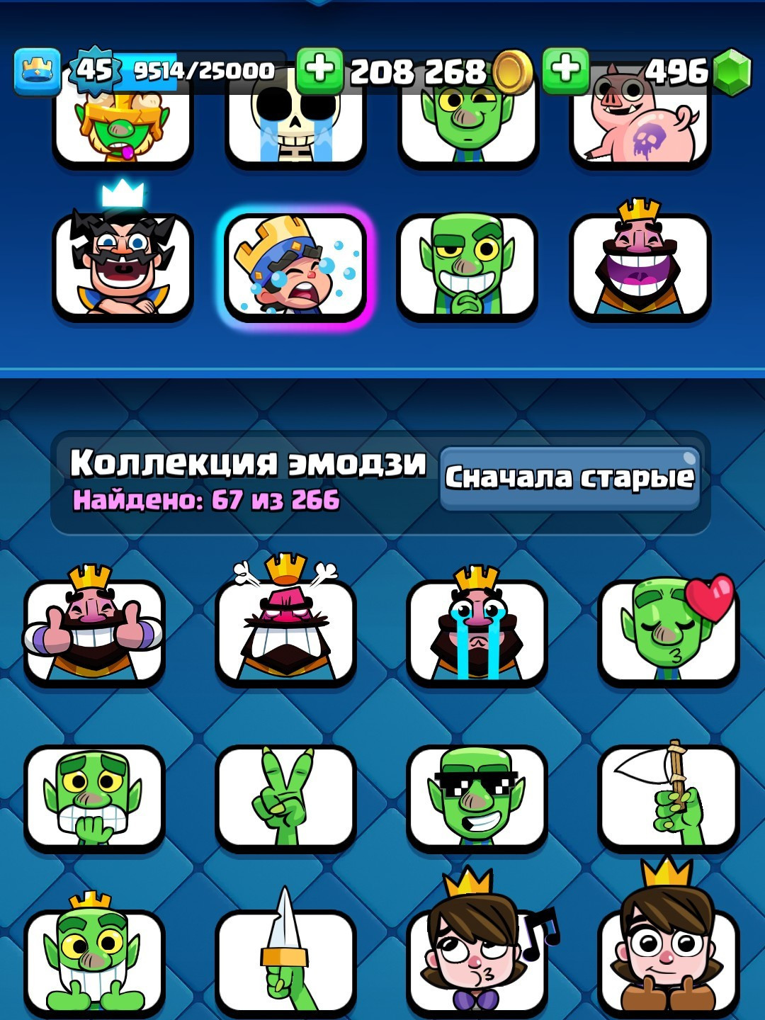 8728 кубков, есть все карты две золотые и 12 с эволюции, 67 эмодзи, 9 видов башни, 63 знамени и 91 рамки 45 лвл