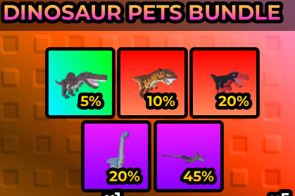 После покупки вы получите 5 шт Dinosaur Pets Bundle. Из набора может выпасть: Spinosaurus 5%, Carnotaurus 10%, Utahraptor 20%, Bronhiosaurus 20%, Pterodactyl 45%. Товар передается подарком (гифтом).